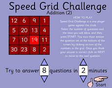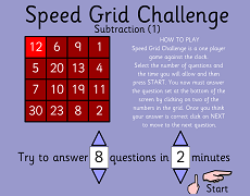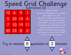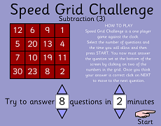 Subtraction Grid Challenge– Level 2Speed Grid challenge Level 2 is just a bit harder than Level 1. Answer the question at the bottom of the screen by clicking on two numbers in the grid. |