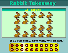 Rabbit TakeawayIf some rabbits run away how many will be left? A two level game using numbers to 20 and subtraction. |