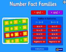 Fact families 3+5 = 8, 8-3 = 5, 7x8 = 56, 56/8 = 7 etc
